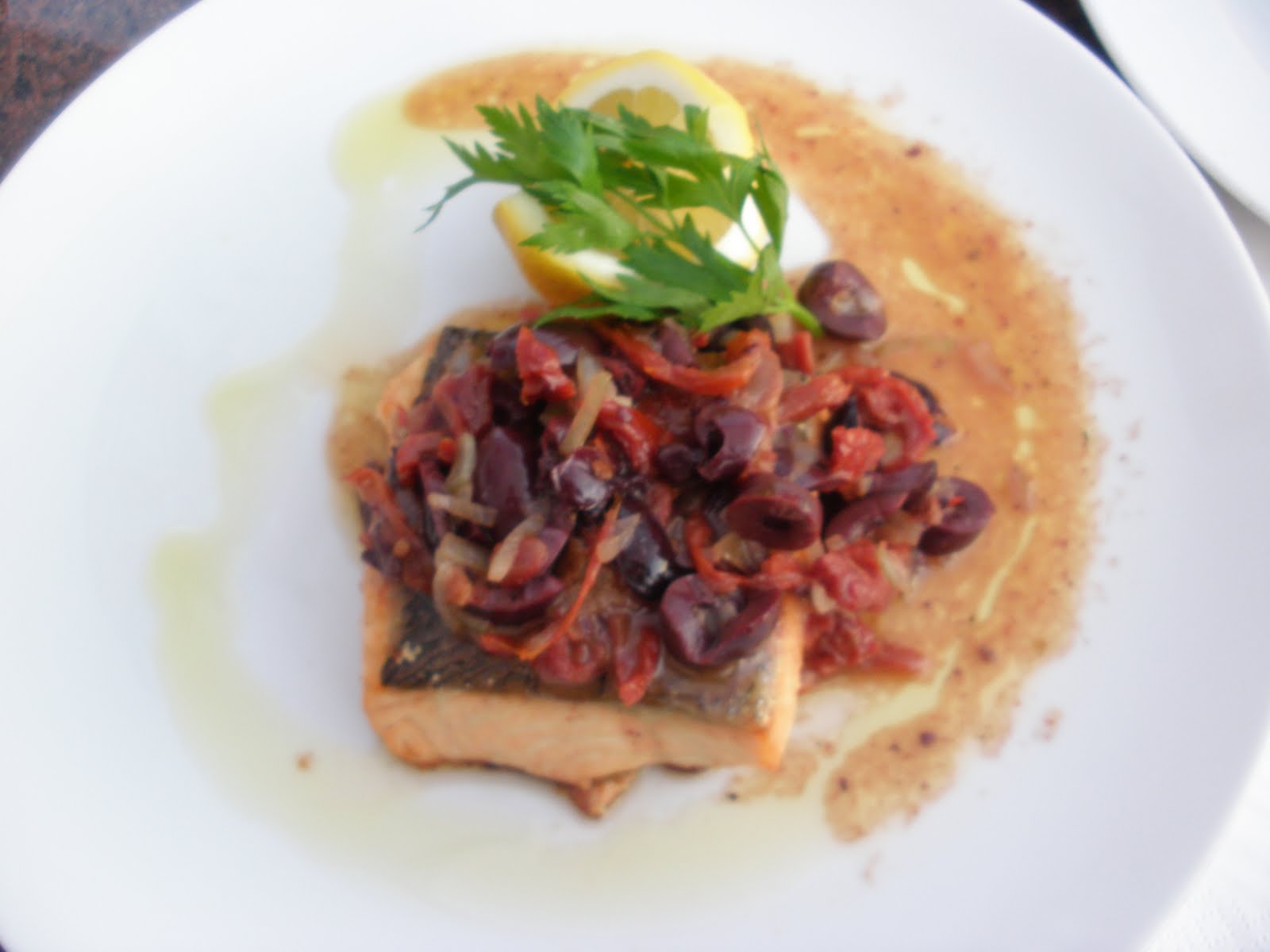 I opted for the grilled salmon with olive and sun-dried tomato tapenade at 325kč.
